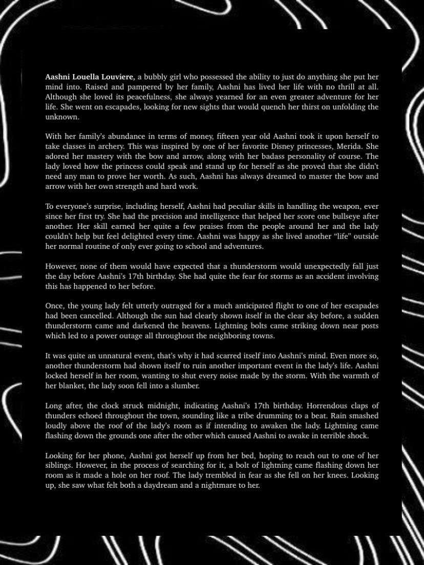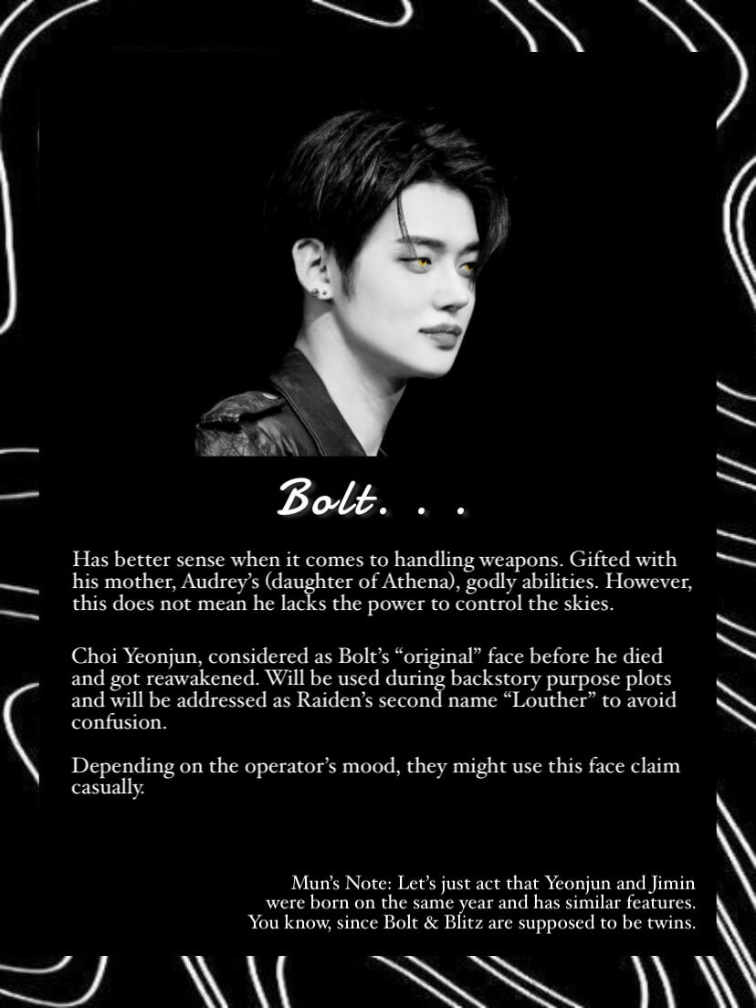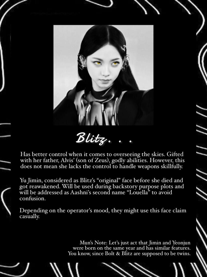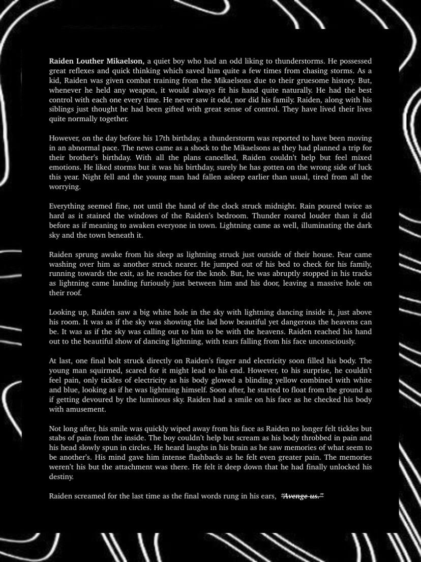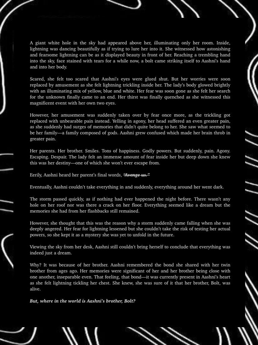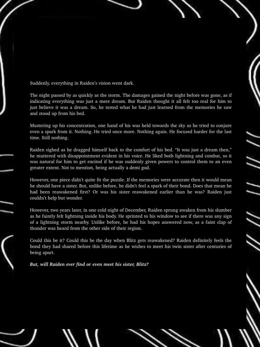Blitz, the girl, had the slight control of manifesting lightning at age five. Bolt, the boy, had the skills of a warrior discovered at the early age of four. Although they were better at some aspects of their own abilities, the two of them actually had inherited both of their parent’s godly powers. With this, their parents taught them to help each other improve in their lacking aspects. Blitz had to help with Bolt’s control of the skies and Bolt had to help with Blitz combat skills. With such hard training their bond grew deeper as they helped each other grow. As such, the twins were inseparable, hand in hand wherever they went to. Life was hard for training and hiding as a demi-god for the twins, however, they never expected it to get even harder.